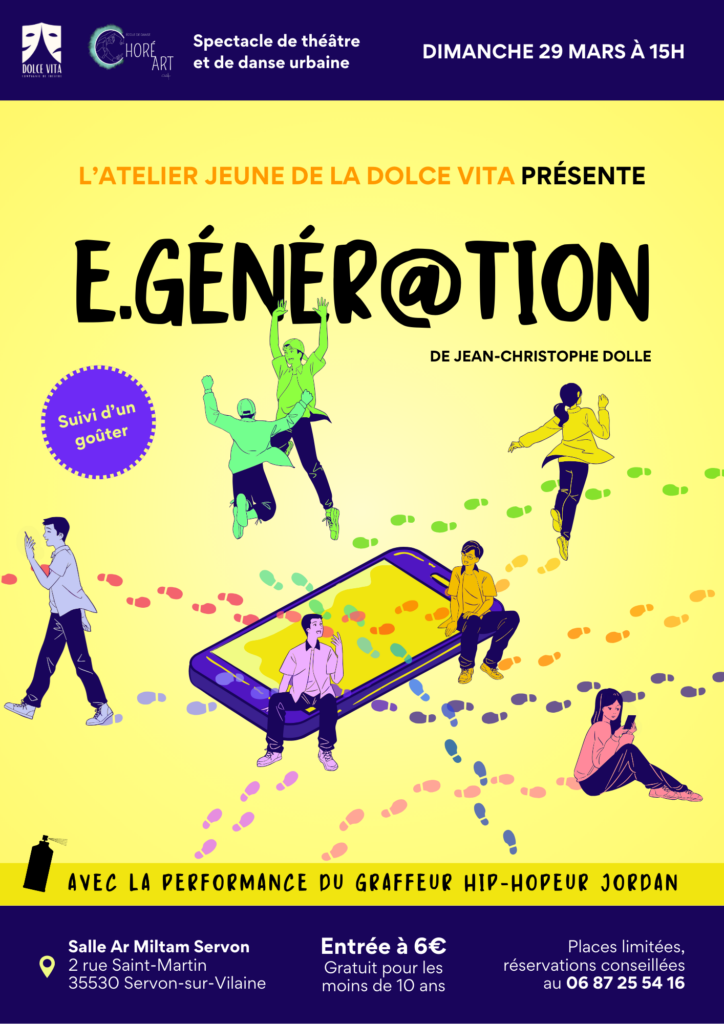 Dans le cadre de la représentation de la pièce E.Génér@tion par l’atelier jeune de la Dolce Vita, groupe de théâtre à Châteaubourg, j’ai réalisé l’affiche suite à la demande du groupe afin que celle-ci puisse être imprimée et distribuée, ou partagée en ligne.